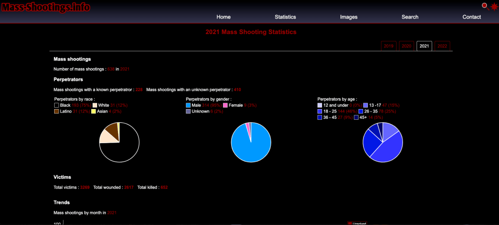 Further, they claim that there were 638 “mass shootings” in America in 2021 alone. This is a blatant misrepresentation of the data, and they do it in order to bump the number of Blacks committing mass shootings. They show that 75% of perps are black this way. According to the FBI, there were 61 mass shootings in 2021 According to mother jones, which only counts deaths, the total is 6, other figures put it between 60-120 based on the standard criteria of a public place and high casualties. In short, they are dramatically inflating the number of shootings, and they’re doing it to make blacks look bad.